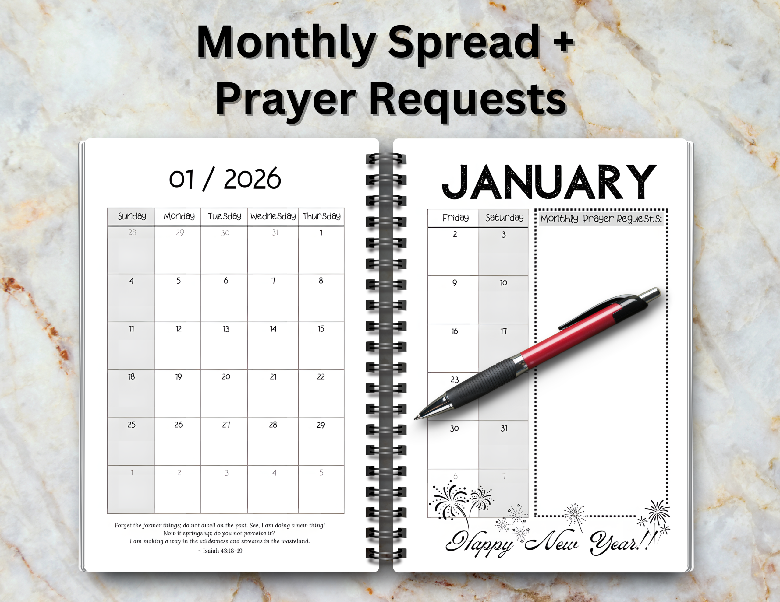 - Monthly Calendar Spreads with scripture-based themes to ground each month in biblical truth